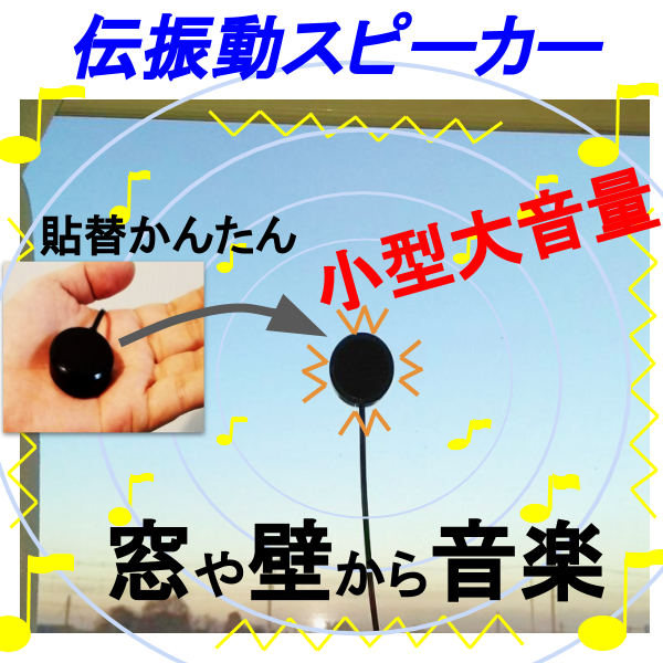 壁板・窓ガラスなどに音の振動を伝えて、スピーカーコーンの代わりをさせる為、超小型品で大音量♪